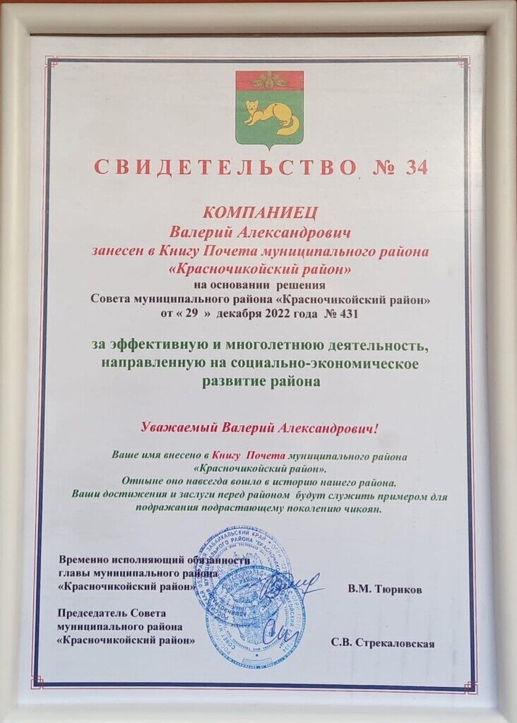 «Ваше имя внесено в Книгу Почета муниципального района «Красночикойский район». Отныне оно навсегда вошло в историю нашего района. Ваши достижения и заслуги перед районом будут служить примером для подражания подрастающему поколению чикоян», — говорится в свидетельстве почетного гражданина района.